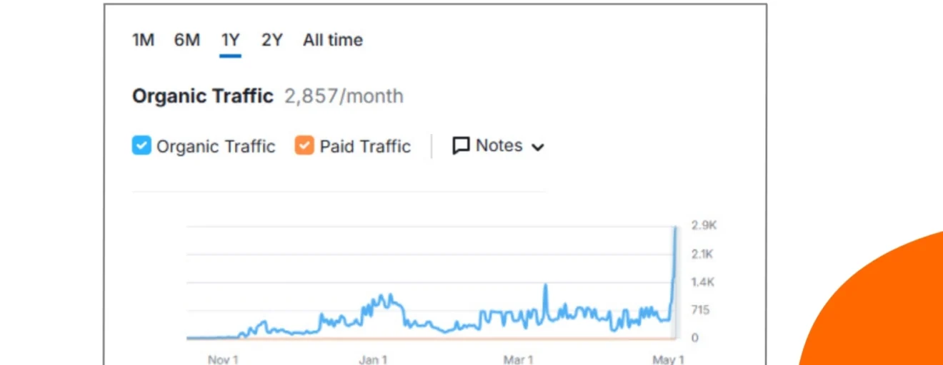 - Current Traffic: 2,857 visitors/month, with a sharp spike in early May.